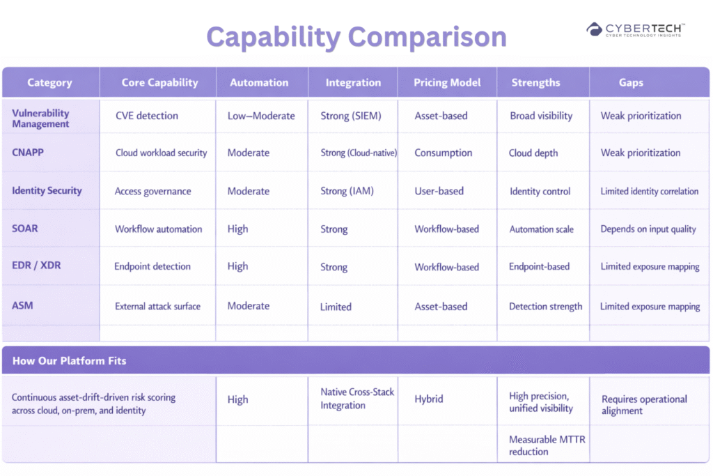 The vendor ecosystem reflects the same fragmentation seen inside enterprises. Most tools solve a specific layer of the problem. Very few provide unified visibility, prioritization, and action across environments.