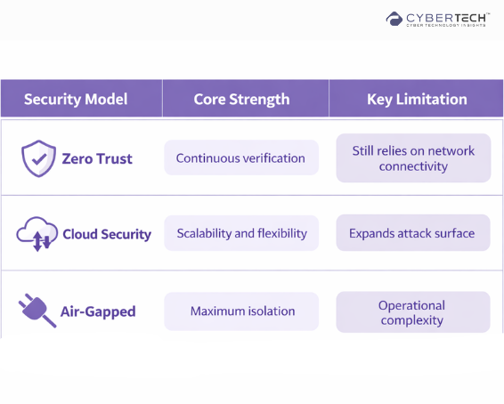 Unlike other modern security frameworks, which presume breaches, air-gapped systems aim to completely avoid outside access, making them highly effective for safeguarding mission-critical assets.