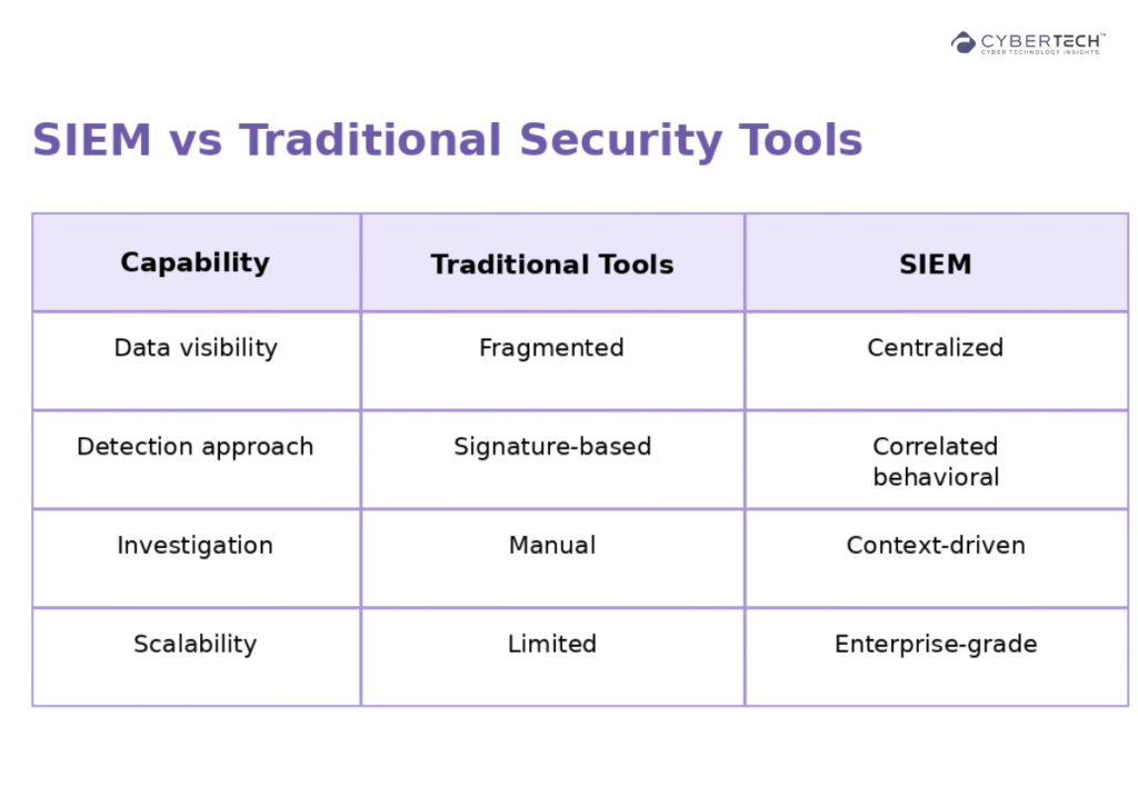 SIEM represents a shift from fragmented, tool-specific security monitoring to a unified, intelligence-driven approach. Traditional security tools operate in isolation and rely heavily on signature-based detection, which limits visibility and slows investigation.
