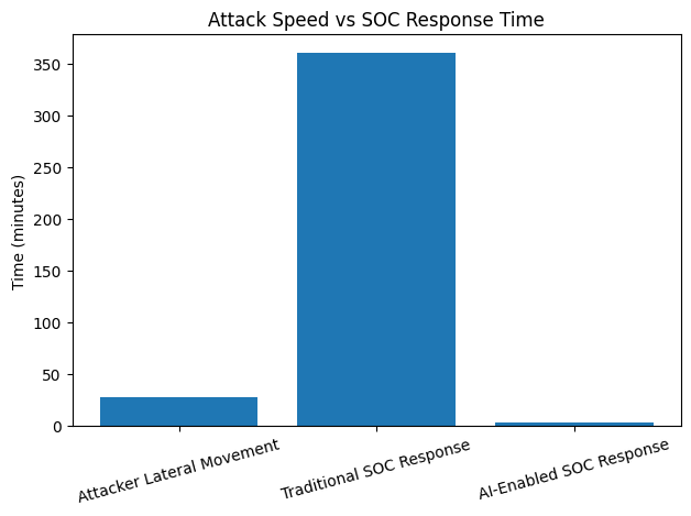 Attackers can move laterally in as little as 27 minutes (average 48 minutes). According to ReliaQuest’s 2025 Annual Threat Report, AI-enabled SOCs can contain attacks in roughly 3 minutes as opposed to 6 hours for conventional approachttps://reliaquest.com/blog/insights-from-reliaquests-2025-annual-threat-report/hes.