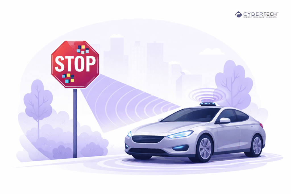 The popular illustration is a modified stop sign confusing a self-driving car.